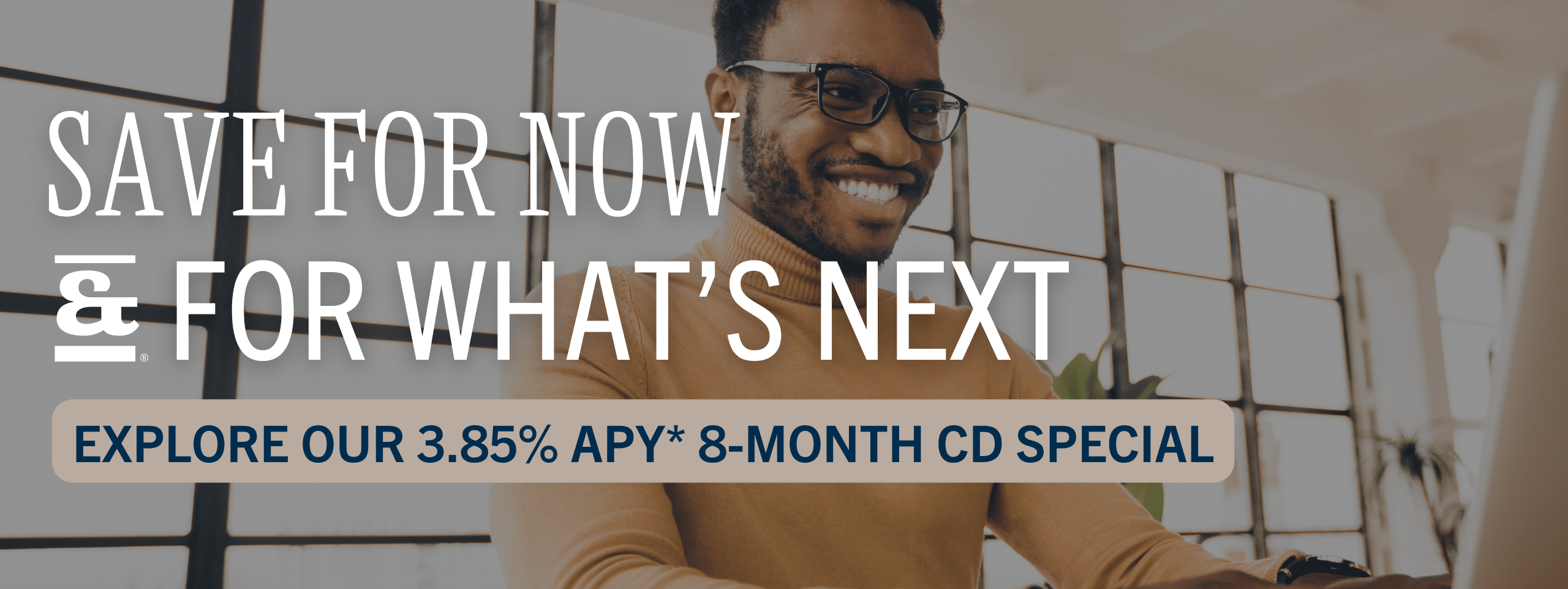 *3.85% APY is available on a new 8-month Certificate of Deposit opened with a minimum of $1,000.00. APY is accurate as of 11/12/2025. A penalty may be charged for early withdrawal. Fees may reduce earnings. No additional deposit may be made to the CD during the term.